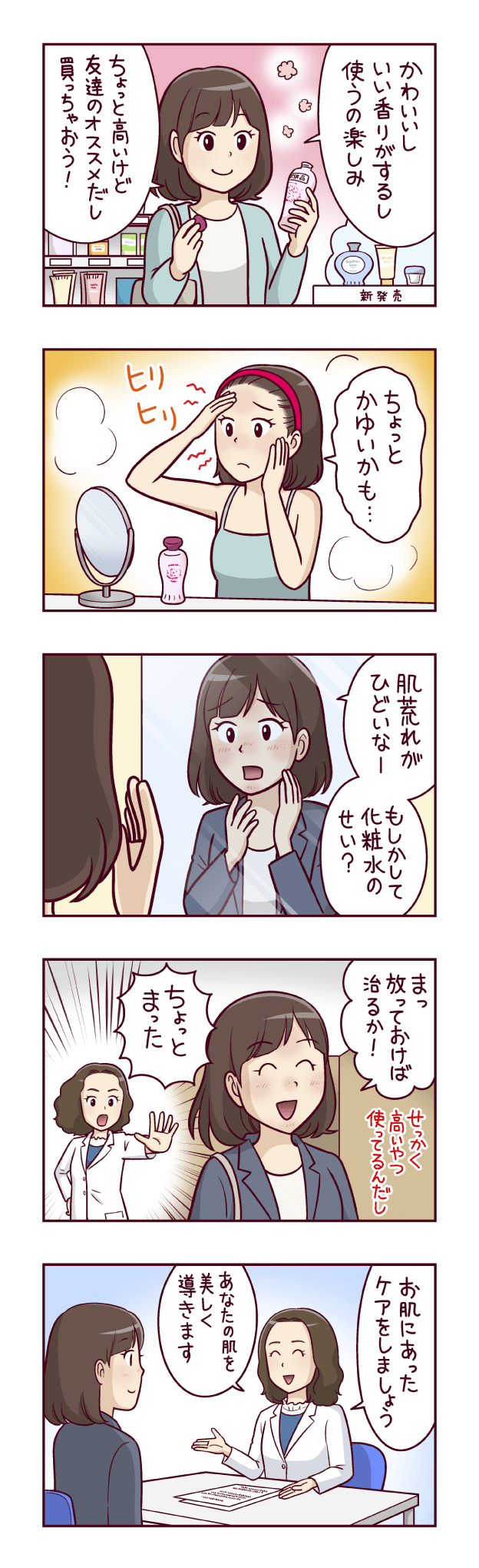 高い化粧品を使っている自分に酔っているところもあったと思いますが、高かったのだから、使い続けたら綺麗になるはずと、鏡に写っている自分の肌からは目をそむけ、熱心に使いました。結局、お金が続かず、使うのはやめたのですが、その結果、にきびはなくなりました。友達から『肌ひどかったよねー』と言われて初めて自分の状態に気付かされたことがありました。
