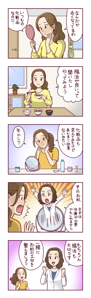 ですが、赤くなったりかゆくなったり乾燥したり、通常起こりうる反応だとわかっていて、その先に美肌があると知っていても、個人的には耐えられませんでした。そこから刺激の少ない化粧品に変更し、肌のバリア機能の正常化をはかりました。それと同時に腸内環境の改善を図るべく、発酵食品を取り入れた食事、いわゆる腸活を積極的に行ってみました。