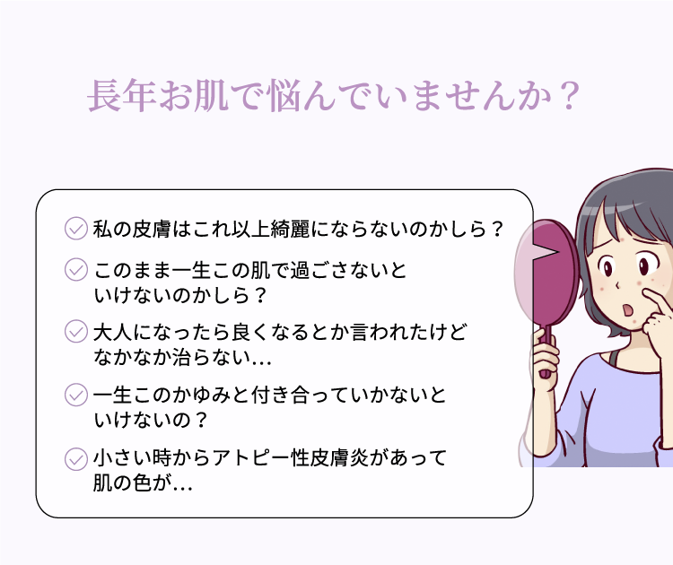 上記のようにご自分の皮膚のことで長年悩んでいませんか?そのお悩み、すべて私たちにお任せください。まずは、一度お気軽にご相談ください。どんなことでも丁寧な対応をお約束します。
