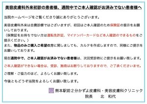 美容皮膚科外来は自費診療ではございますが、初回はご本人確認のため保険証の提示をお願いしております。(保険証をお持ちでない方は、運転免許証、マイナンバーカードなど本人確認のできるものをご提示ください。)