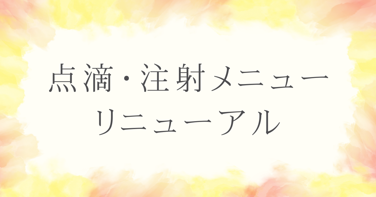 こんにちは☘️当院ホームページをご覧いただき、ありがとうございます! この度、新しい点滴・注射のメニューが出来ました!👏 注射メニューに2種類追加に...