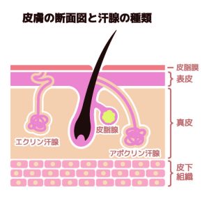 皮膚の表面を覆っている表皮には毛器官(毛と毛包)が毛孔として、また、汗を出すエクリン汗腺が汗孔として皮膚の表面に開口しています。