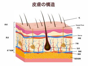 人の皮膚は、表皮、真皮、皮下組織から構成されています。