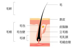 皮膚表面に出ている部分は毛幹、皮膚内部にある部分を毛根と呼びます。毛包は毛を包んでおり、毛の成長を支持し皮膚の外へガイドする役割をもっています。