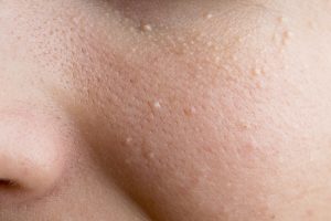 おでこや頬、鼻の周囲にできる直径1〜5mm、10mm以上になる黄白色、白色の小さく盛り上がったできものです。でこぼこしている印象があり、また、できものの中央に凹みがあります。おでこや頬にぱらぱらと単発していたり、目の下から頬にかけ多発していたりします。時々、できものから皮脂が排出することがあり、押したら白いものが出てきたと言われる方もいますが、次に説明する稗粒腫(はいりゅうしゅ)とは別のものです。脂性肌の人に生じやすいできものです。
