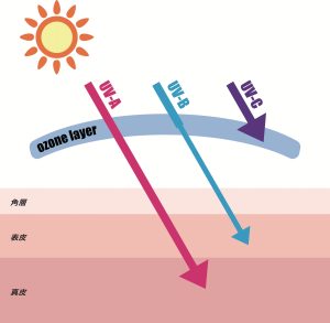 *紫外線・・・波長の違いで、UVA(320−400nm)、UVB(290−320nm)、UVC(190−290nm)に分類される。UVCはオゾン層で吸収されるので、地上に届くUVA、UVBが問題になる。UVAは通常の窓ガラスを通過し、皮膚の深くまで到達する。UVBは窓ガラスは透過せず、皮膚の浅い層まで。