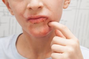 乳幼児から小児の口周囲に好発します。唾液や食べ物による刺激性接触皮膚炎。